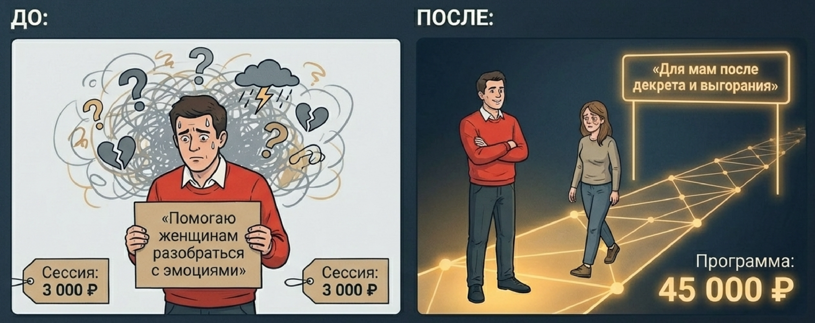 Он перестаёт продавать склад навыков, начинает продавать конкретный результат.