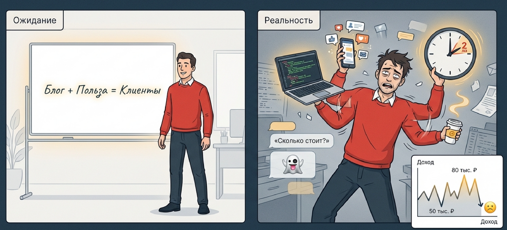 Картинка, которую вам продавали, выглядела просто: ведёшь блог, даёшь пользу, делаешь прогрев — и клиенты сами приходят.