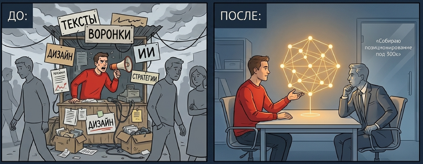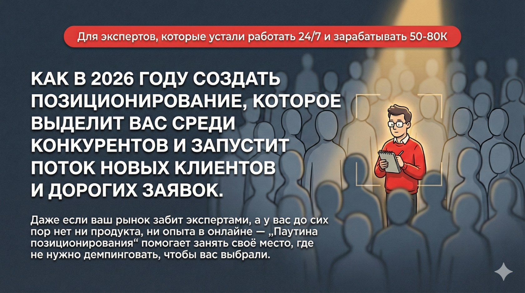 позиционирование: «Эксперт, который собирает из вашей каши в голове позиционирование под 300К»;