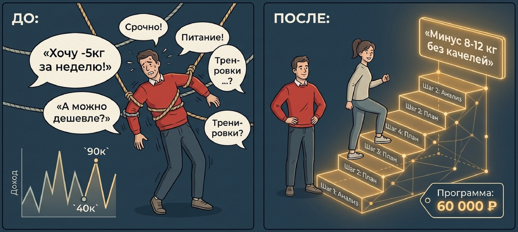 клиент: «хочу минус 5 кг за две недели, а можно дешевле?»;